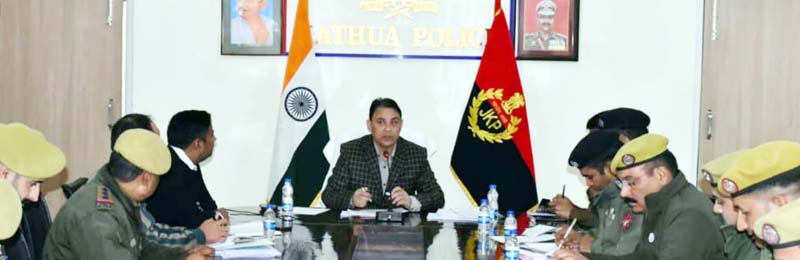 KATHUA, Dec 11: In view of important events and general security situation in the district, SSP Kathua R. C Kotwal accompanied by Additional, SP Kathua, Suresh Kumar Chib-today chaired a security review and crime review meeting of Sub Division Kathua and PS Rajbagh at Conference Hall, DPL Kathua with the officers including DySP, PC Kathua, DySP Headquarter, Kathua, SHO PS Kathua/Rajbagh in charge, PP Marheen/Nagri/Hatli and their IOs.
