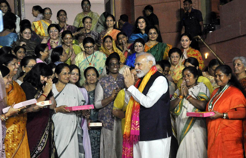 This is proof of fulfilling “Modi’s guarantee” that he will usher in a new era of women-led development, the Prime Minister said amid loud cheers from the women present at the BJP headquarters.