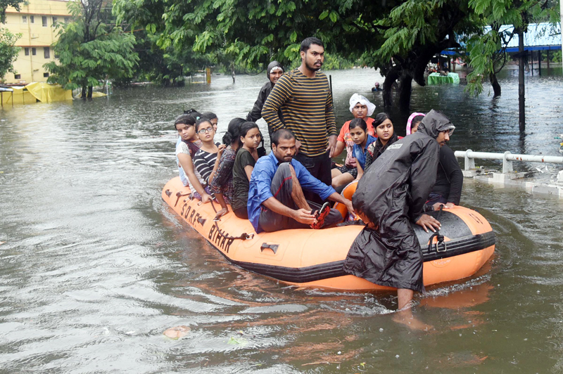 State Disaster Response Force (SDRF) workers rescue people from flood-affected area of Rajendra Nagar in Patna on Sunday. (UNI)