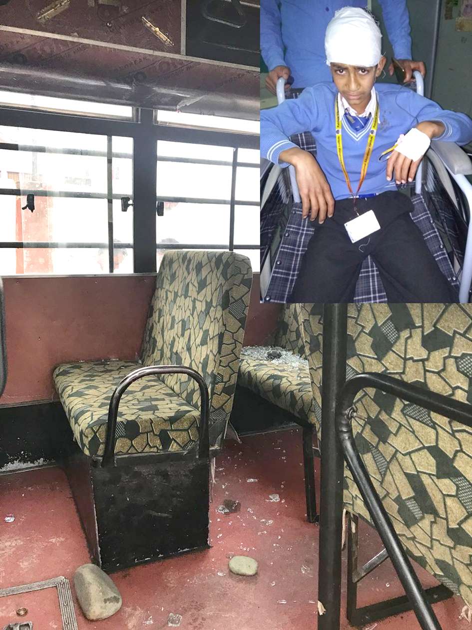 Stones pelted inside school bus (left) and an injured student (inset). —Excelsior/Younis Khaliq By Daily Excelsior - May 3, 2018 Share FacebookTwitterWhatsAppPinterestLinkedinCopy URLTelegramEmailTumblrReddItPrintKoo Stones pelted inside school bus (left) and an injured student (inset). —Excelsior/Younis Khaliq Follow our WhatsApp channel