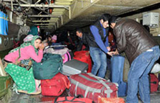 Stranded passengers boarding IL-76 Aircraft at Air Force Station, Jammu on Monday.