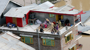 Stranded people signaling for help in the flood affected part of Srinagar on Wednesday.