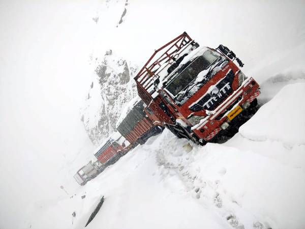 Stranded trucks on Mughal Road in Poonch on Friday. -Excelsior/Bali