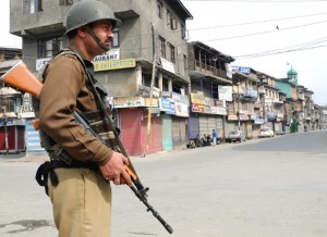 March – 20,2013- Srinagar :A Security Forces Jawan stands Guard in Srinagar on Wednesday. Life in Kashmir valley came to a standstill on Wednesday in wake of the strike call given by Majlis-e-Mashawarat, an amalgam of various separatist organizations. Shops and business establishments remained closed and traffic was off the roads. Valley has been tense after the killing of a youth in CRPF firing, in Downtown in Srinagar on March 2. Photo/Mohd Amin War