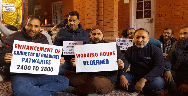 Srinagar, Mar 6: Striking Patwaris under the banner of All J&K Patwar Association (AJKPA) today staged a protest at the Deputy Commissioner’s (DC) office to press for the resolution of their long pending demands.