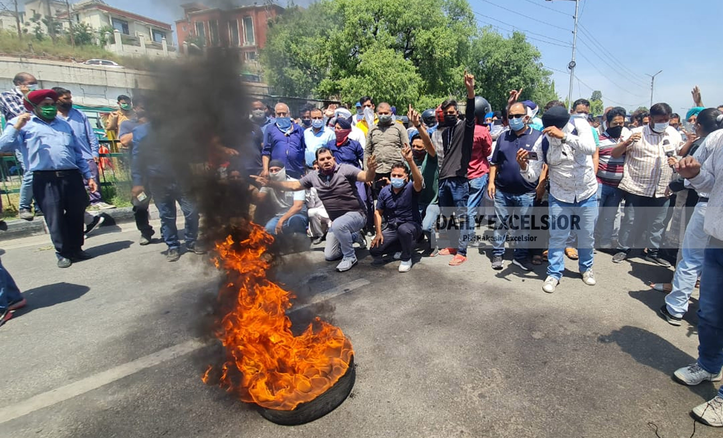 Led by T S Wazir, chairman of the All J-K Transport Welfare Association, the protesters assembled on the main road outside the General Bus Stand in the city. They set ablaze a tyre and chanted slogans in support of their demand.