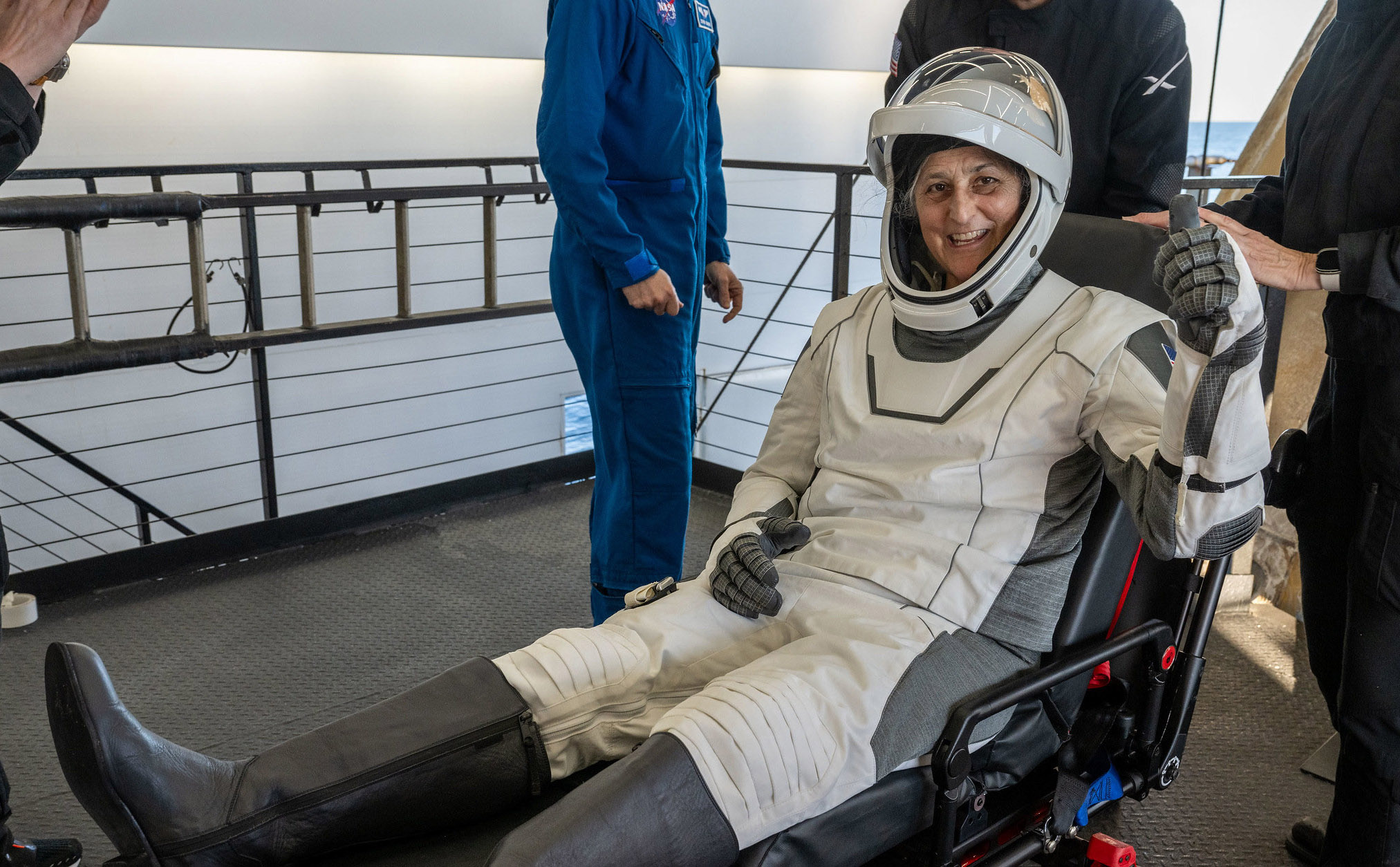 Dolphins circled the capsule as divers readied it for hoisting onto the recovery ship. Once safely on board, the side hatch was opened and the astronauts were helped out, one by one. Williams was next-to-last out, followed by Wilmore who gave two gloved thumbs-up.