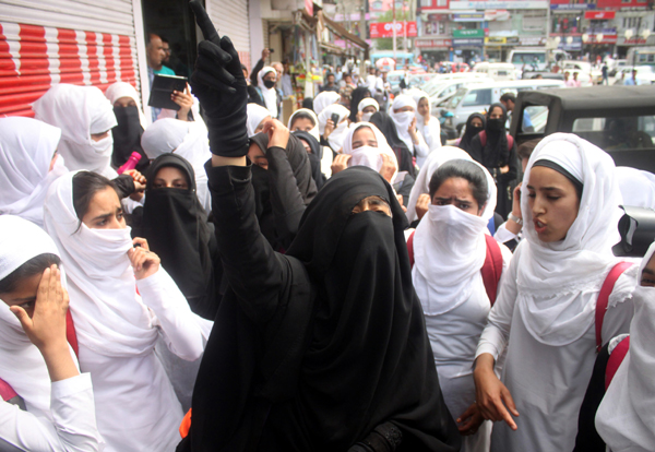 While police were dealing with male students, groups of female students staged protests at Regal Chowk and Residency Road in Lal Chowk commercial hub against the State. They were demanding end to police crackdown against the students and youth in Kashmir. Police were seen persuading the female student protesters to disperse which they repeatedly refused.