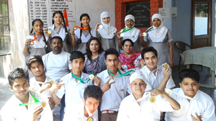 Students of Co-operative Public School, who blossomed in the Inter-School Speedball Championship, organized by ASN Higher Secondary School, Channi Himmat, Jammu. The School won 7 gold, 5 silver and 2 bronze medals, and the medal winners included Shubham, Shehnaz, Jagjot, Himanshu, Harish, Danish, Isha, Aditya, Aman, Wasim, Sabia, Fareen, Ajay, Tanu and Parvinder. The Principal of the School, Veenu Chopra and coach Sunny Nanda are also seen in the picture.