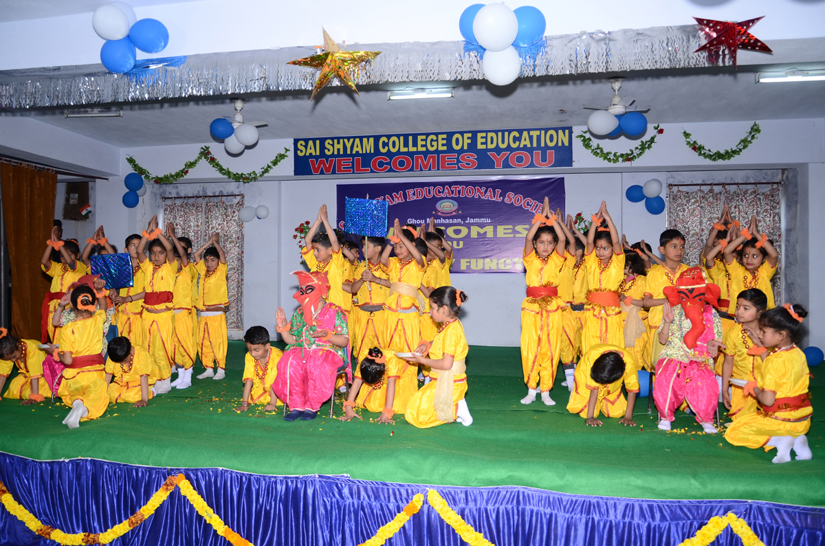 Students in colourful attires presenting cultural item while celebrating Annual Day organised by Sai Shyam Educational Society in Jammu.