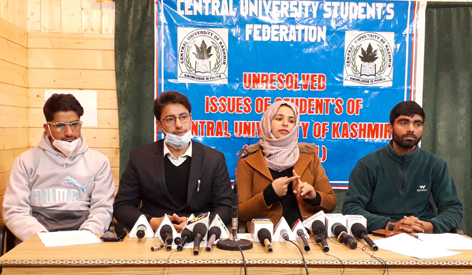 Students of Central University Kashmir addressing media in Srinagar on Monday. – Excelsior/Shakeel