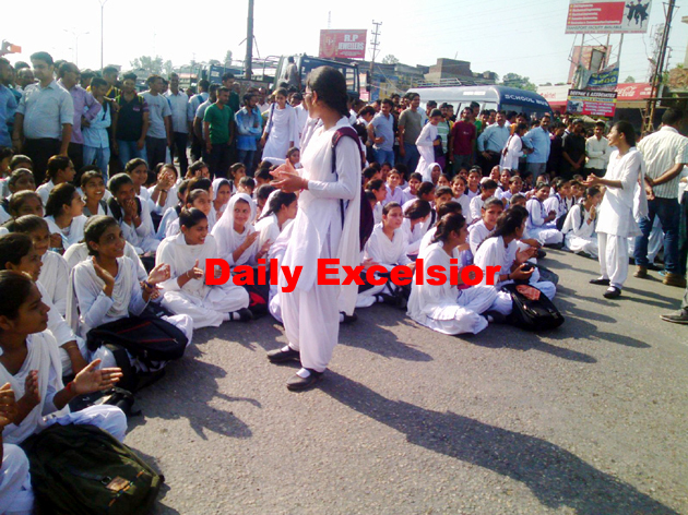 Students of Government Girl Higher Secondary School, Samba blocked national high way at main chowk, Samba over the issue of shortage of teaching staff, this morning….Excelsior\Gautama Samba