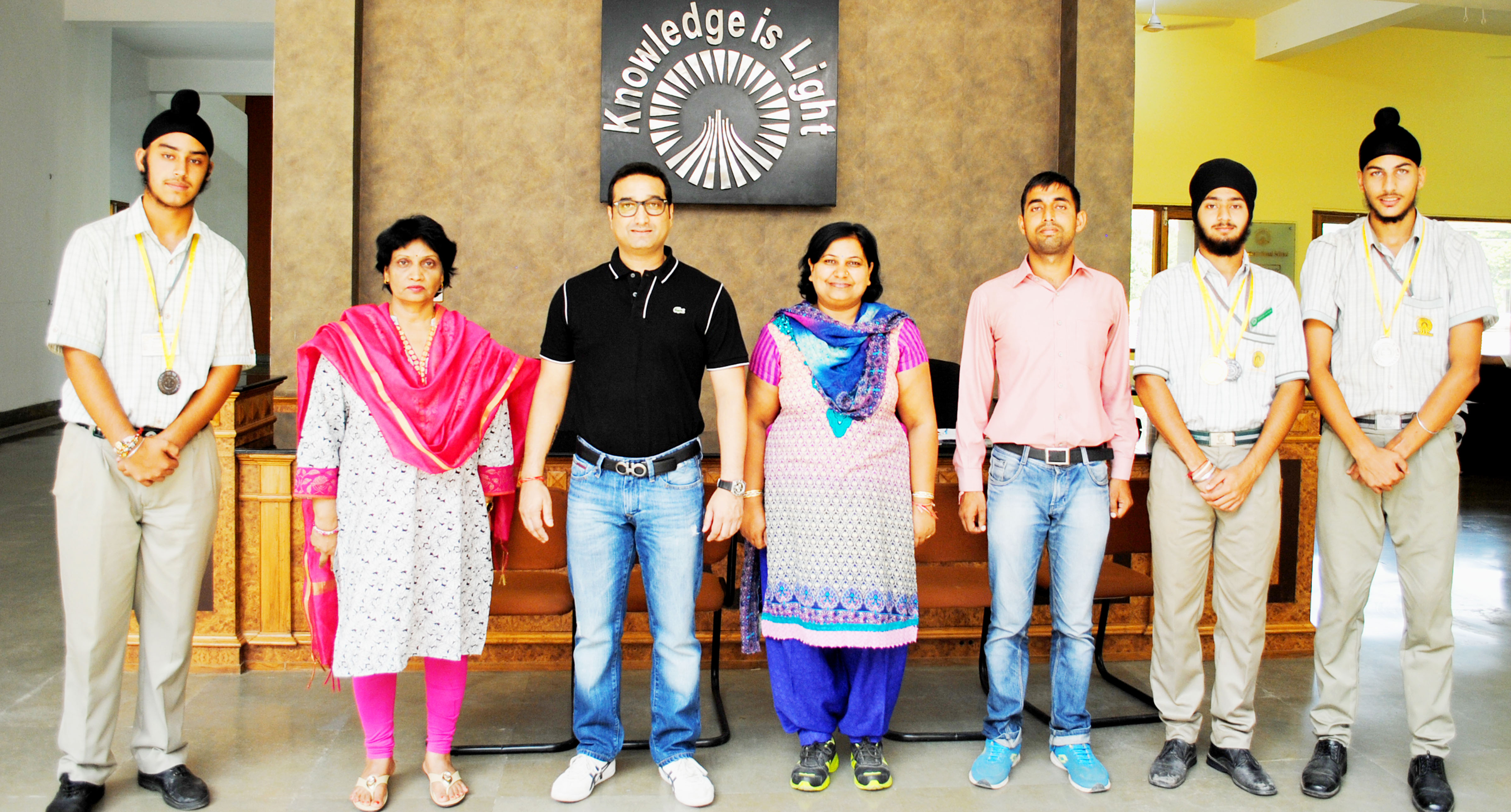 Students of KC International School who brought laurels to the institution in Inter-School Athletic Meet, organized by the Department of Youth Services and Sports at MA Stadium recently. K C International school won two gold, one silver and two bronze medals. In Under-19 category, Paramveer Singh won gold medal in triple jump and silver medal in long jump, while Kunwarpal Singh won gold medal in discus throw and bronze medal in Javelin throw. In Under-17 category Jagpreet Singh won bronze medal in discus throw. Also seen in the picture are Vice Chairman, Chaitanya Chowdhary, Principal Maya Mishra, Activity Co-ordinator Rajni Malhotra and coach Pardeep Sharma.