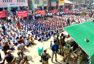 The peace march started from Boys Higher Secondary school Bhaderwah and on the way was joined by students of Kendriya Vidhalaya, Bhaderwah Campus, GDC Bhadarwah and Girls Higher Secondary school. After passing through different markets including Link road, Laxmi Narayan Chowk, Sadar Bazaar, Pasri Bus Stand and Ganpat Market, all the students gathered at historic Seri Bazaar where they observed two minutes silence to pay homage to the Uri martyrs. The students while holding banners reading “Peace March” made an appeal for world peace.