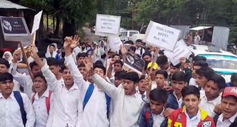 A large number of students from Government Higher Secondary School assembled out the school premises and held protest against the Education Department.