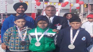 Students of R.M. Public School, who brought laurels to the School by winning 2 silver and one bronze medal in the Kick Boxing National Championship held at Faridabad in Haryana, recently. 6 students of RM Public School participated in it and the players who won medals included Jaskirat Singh (silver), Karanjot Singh (silver) and Jaskaran Singh (bronze) medal. Kanavary, Uday Pratap and Vikrant got participation certificates. School Chairman, Rameshwar Mengi.; Trustee, Reeta Mengi and Principal Ravinder Kour honoured these students and their coaches Rajesh and Nardeep Singh.