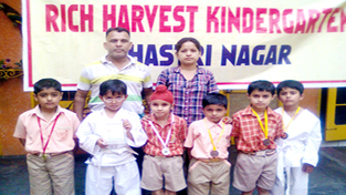 The students of Rich Harvest School who won six medals, with 1gold, 2 silver and 3 bronze in Karate-Do Championship, organized by RGKFI and AJKSSKA in Jammu recently. The students were imparted training by Sanjeev Dewan.