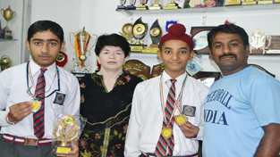 The students of S D Tara Puri High School who brought laurels to the Institution by winning medals in International Speedball Championship, posing for a photograph along with School Principal, Neeru Puri. The medal winners included Gurmanjeet Singh of class 8th (gold), Aryan Kangotra of the same class (silver) and Ankit Sharma (silver). The Principal of the School and Vice Principal, Saroj Goel congratulated the students and their coach, Sunny Nanda for this splendid achievement.