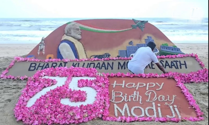 PURI, Sep 16: Renowned sand artist and Padma Shri awardee Sudarsan Pattnaik created a magnificent sand sculpture of Prime Minister Narendra Modi, accompanied by an installation of