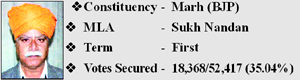 Marh Constituency which is spread over a large area comprising 26 panchayats (20 of Marh constituency and 6 of Satwari) and some area of Ward No. 61 (Patta) with a strength of 68,870 electors, was won by Sukh Nandan Kumar in 2008 by defeating with 6,581 votes the then MLA, Ajay Kumar Sadhotra, who ruled the Constituency for two consecutive terms.