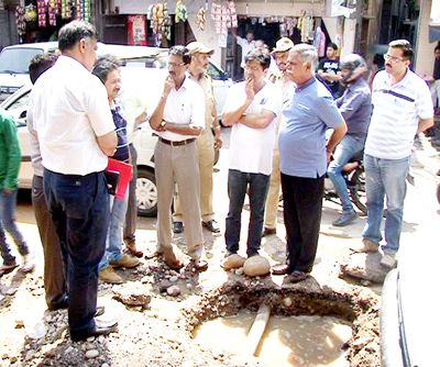 PHE Minister Sukhnandan Kumar inspecting leaked water pipes in Old Jammu city on Saturday.