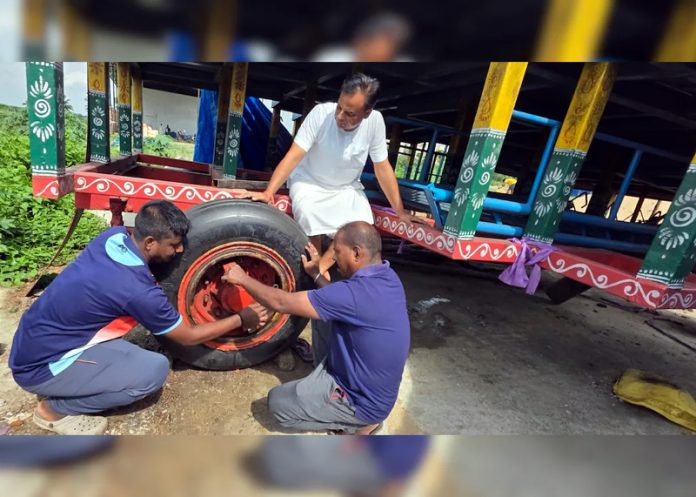 Each of the four tyres can withstand a load of 16 tonnes. The chariots of other deities will have iron wheels as usual.