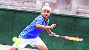 Sumitpal in action while playing a forehand shot during a pre-quarterfinal match of AITA Tournament in Chandigarh.