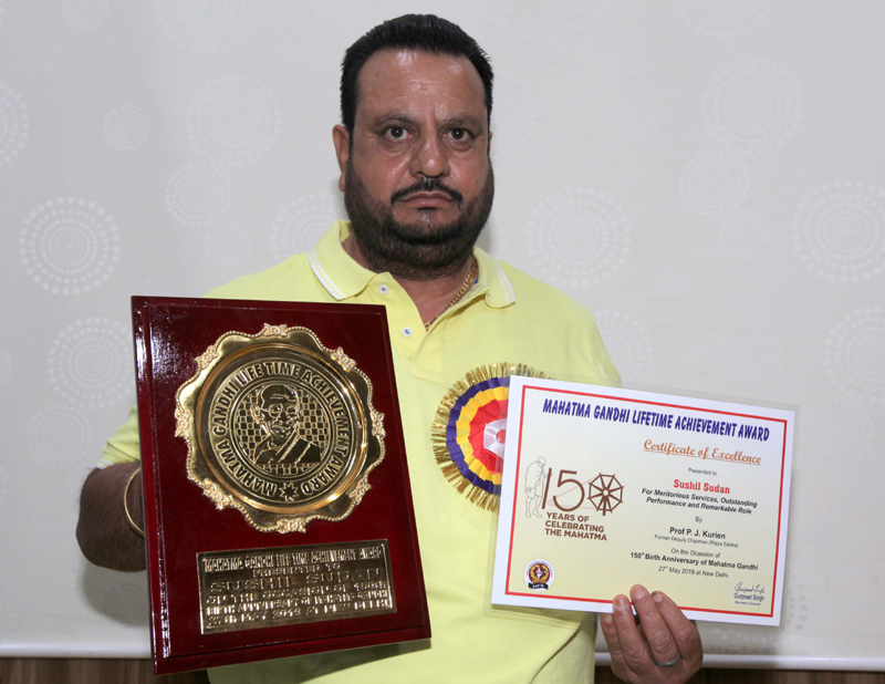 JAMMU, June 3: Prominent Trade Unionist and president Jammu Kashmir Medical Employees Federation, Sushil Sudan, has been conferred with prestigious Mahatma Gandhi Lifetime Achievement Award by India International Friendship Society (IIFS), New Delhi in recognition of distinguished services by him.