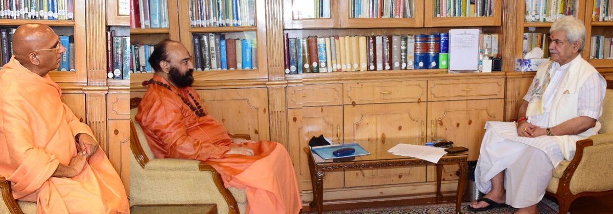 Srinagar, July 1: Swami Avdheshanand Giri Ji Maharaj, Member, Shri AmarnathJi Shrine Board & Mahamandleshwar, Juna Akhara; and Mahant Deependra Giri, Custodian Chhari Mubarak Shri Amarnathji today called on the Lieutenant Governor Manoj Sinha at Raj Bhavan here.