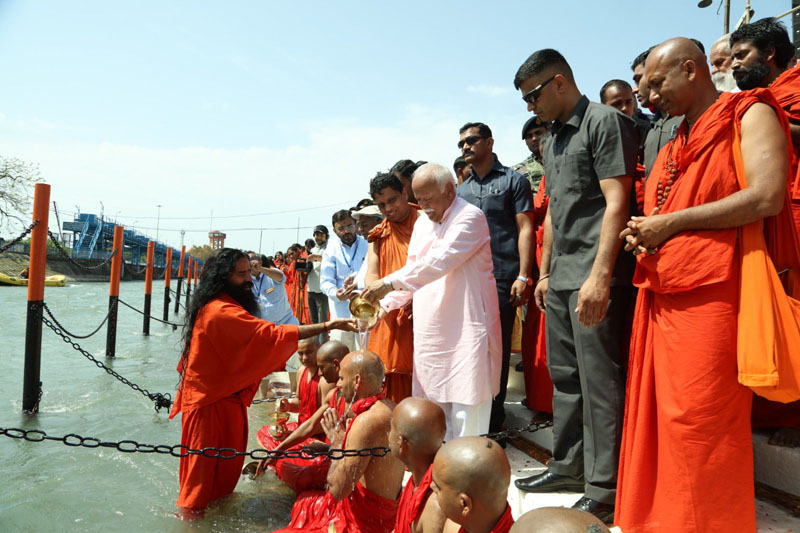 Swami Ramdev along with RSS chief Mohan Bhagwat performing ‘sannyas’ rituals of his disciples on the bank of River Ganga at Haridwar.