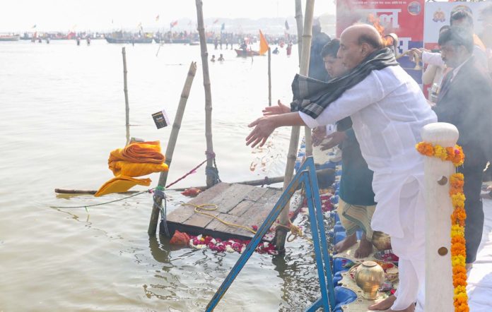 The Defence Minister reached DPS Ground Naini by helicopter from Bamrauli Airport as per his pre-scheduled programme. He reached Sangam via a jetty from Arail Ghat of Naini and took a bath.