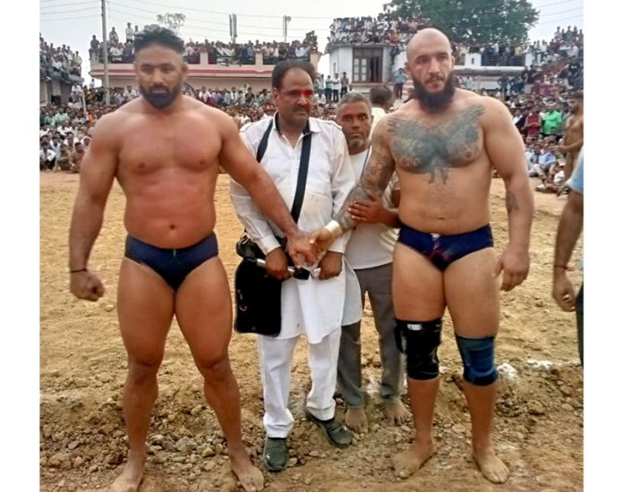 KATHUA, June 19: The 96th edition of the historic Ramkote Kesri Dangal was held at Ramkote, Kathua, drawing thousands of enthusiastic spectators. In the final and most anticipated bout, Talib Baba Fly triumphed over Jhonti Gujjar Akhada, claiming the prestigious title. He received a cash prize of Rs 2,50,000, presented by Chief Guest Satish Sharma (MLA Billawar) and Gushu Malasia, who sponsored Rs 2,00,000. Director Tourism Vikas Gupta, BDC Abay Khajuria, and others were also present.