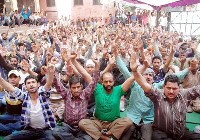 A large number of workers under the leadership of Tanveer Hussain, Union president assembled at PHE complex in the morning and then started protest demonstration. The PHE workers from various districts and divisions including Kathua, Samba, Udhampur, Reasi etc participated in the protest programme. They are demanding framing of regularization policy for all community participation workers, daily rated, ITI trained and need base workers. They also demanded release of pending wages of the last more than thirty five months of these workers.