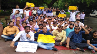 Teachers from J&K protesting at Jantar Mantar in New Delhi on Monday.
