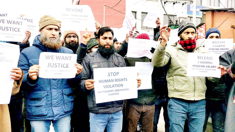 Teachers of Muslim Educational Institute Pampore protesting at Srinagar on Monday. -Excelsior/Shakeel