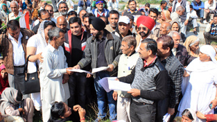 Tehsildar and others distributing claim forms among PoK DPs at rally site near Press Club in Jammu on Wednesday. —Excelsior/Rakesh