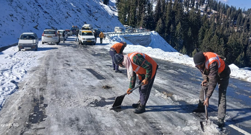 To ensure safety on the frozen surface, BRO officials have been sprinkling salt and urea on treacherous stretches to prevent vehicles from skidding.