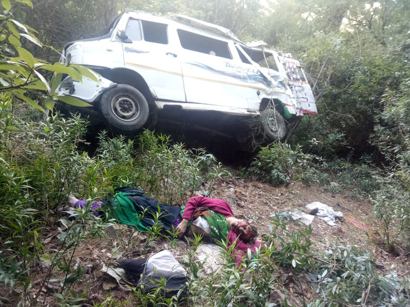 Tempo Traveller lying in gorge after accident near Thannamandi in Rajouri on Monday. Dead body of woman also lying nearby. —Excelsior/Bhat