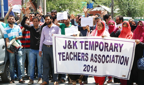 SRINAGAR, July 4: Scores of temporary teachers today staged a protest in favour of their demand of continuation of their services.