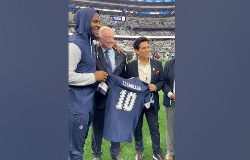 Houston (USA), Oct 14: The legendary Sachin Tendulkar was presented with a custom Number 10 jersey by team owner Jerry Jones in a special honour during a Dallas Cowboys NFL game here.