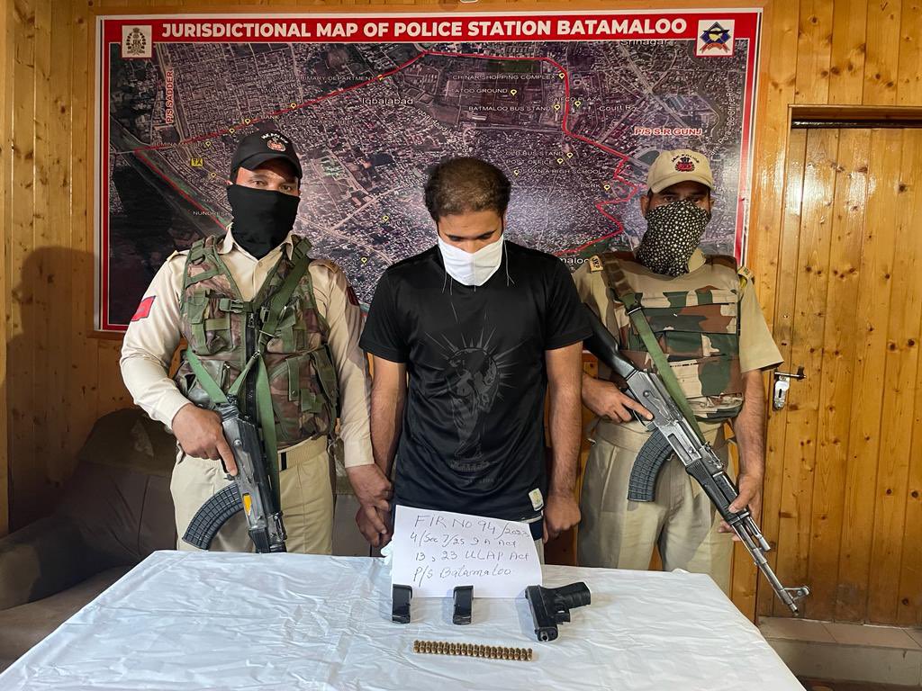 In a tweet Srinagar Police wrote, “A hybrid terrorist of Al Badr namely Arfat Yusuf S/o Md Yusuf of Rajpora Pulwama arrested from Batmaloo with a Glock Pistol, 20 live rounds & 2 magazines.”