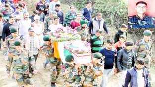 The body of Rifleman Sohan Lal Bhagat being carried for performance of last rites in his native village on Wednesday.  —Excelsior/Rakesh