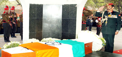 The Chief of Army Staff, General Dalbir Singh paying homage at the mortal remains of Lance Naik Hanamanthappa Koppad, in New Delhi on Thursday.