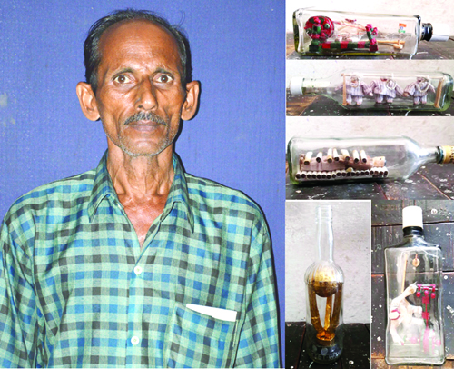 Kewal Krishan is not able to make his both ends meet in village Khokhayal of tehsils Nagri Parole ,District Kathua; but he may well be the craft‘s last sentinel. Kewal belongs to the family of farmers and none of his family members neither learned this art nor they are ready to adopt this art form as his sons prefer to study and work in their own farms for a living. He started practicing this art form in the year 2003 and is the only known artist of Jammu and Kashmir who places objects of different shapes and sizes inside the glass bottle.