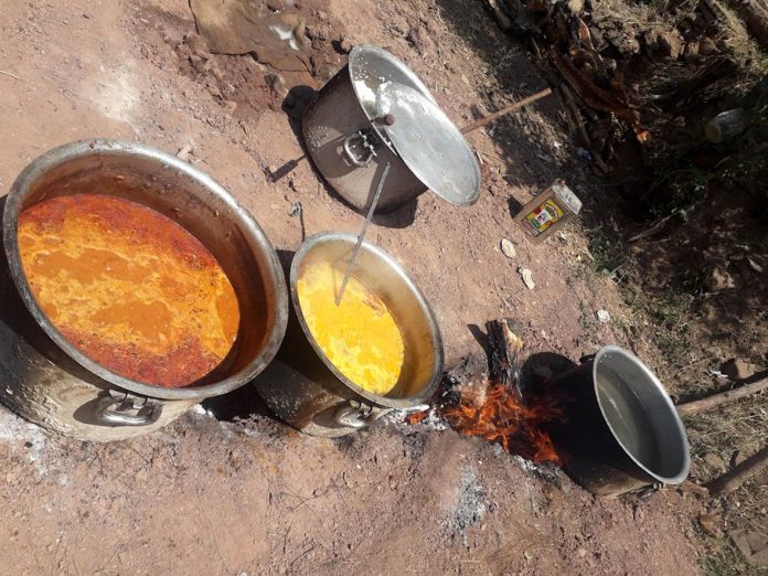 To prepare the food, a long hearth known as ‘Daan’ is dug into the earth, where the wood is arranged for an even burn. In temples, devasthans and other shrines, permanent daans exist, as community feasts, or ‘Bhandaras’, are held frequently throughout the year at such places. Before beginning to cook, the Sain and the elder of the family offer a portion of grains, pulsesand jaggery (Gur) to the deity as an offering, seeking blessings for the feast. Local youth assist the Sain by chopping vegetables, peeling onions and cleaning rice and pulses.