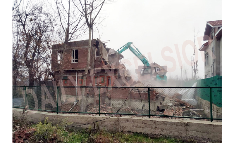 The house of designated terrorist Ashiq Nangroo, built on encroached Government land being demolished at New Colony, Rajpora in Pulwama on Saturday. -Excelsior/Younis Khaliq