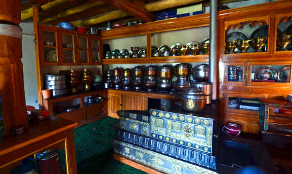 Ladakhi kitchen is usually so large and that it functions as kitchen cum living room. Kitchen also functioned as storeroom in ancient times as its thick walls remained cool during hot summer season.