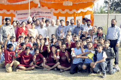 The medal winners of the Jammu District Wushu Championship posing for a photograph along with the chief guest, Ranjeet Kalra, Chairman JKCA Media Committee and Vice- President J&K Wushu Association in Jammu on Tuesday.