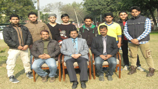 The team of GGM Science College Jammu, which emerged joint winner in the Inter-Collegiate Weightlifting Championship, posing for a group photograph alongwith College Principal, Dr NK Resutra, Physical Director, Dr Vinod Bakshi and Prof Ashok Kumar in College premises on Thursday.