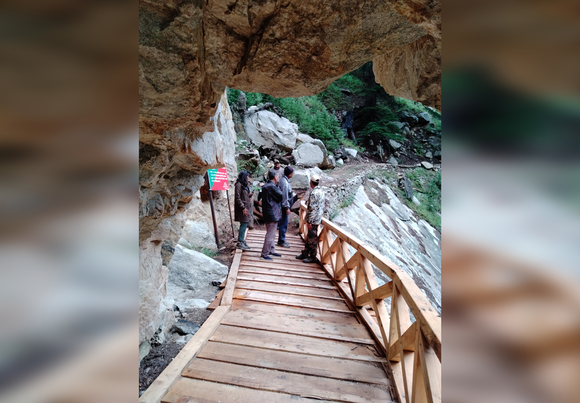Considered one among the most dangerous passages, Gartang Gali rests on wooden planks nailed to wooden poles jutting out of the unyielding mountain side. It was once a route for Indo-Tibetan trade. But when war broke out between India and China in 1962, it had to be closed for the public. Reopened recently to bolster tourism, the 125 meter long bridge has 425 steps made out of sturdy Deodar planks. To have access to it is itself a strenuous exercise. Leave aside the rigid control of the Forest Department on the sightseers – one must produce the Aadhar Card and give details such as permanent address – the approach to the bridge is a difficult trek of steep ascents and descents demanding patience, a degree of physical fitness and alertness. One false step on the narrow path and the person is likely to fall several hundred feet down below. Just before the entrance to trek is a signboard installed by the Forest Department. It lists as many as sixteen instructions to the tourists on how to behave. Instruction No. 10 says that jumping about in excitement or dancing on the trek is prohibited. No prizes for guessing why.